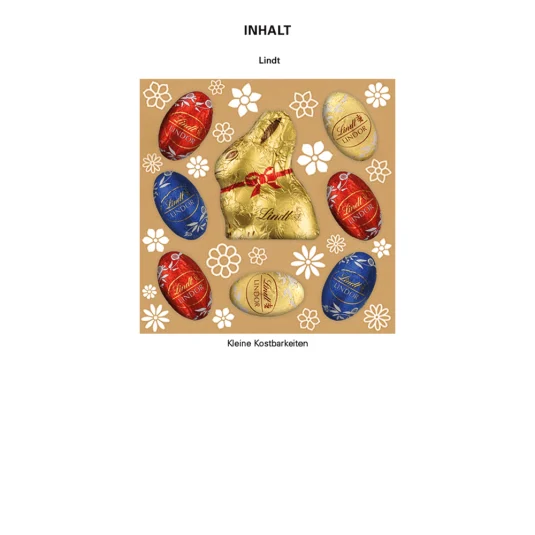Dekorative Pralinenschachtel befüllt mit einem Goldhasen (42 g) und 7 bunt gemischten LINDOR Eiern aus feinster Milchschokolade von Lindt, Box aus weissem, individuell bedruckbarem Karton, mit vorgestanzten Ohren zum ausbrechen und aufstellen, Haltbarkeit ca.