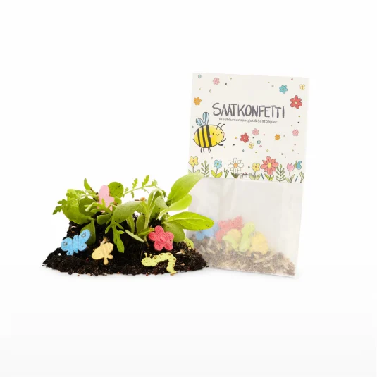 Lose Konfetti-Motive aus Saatpapier, im Pergamintütchen mit individuellem Werbereiter, befüllt mit Saat-Samen zum Selberzüchten von Wildblumen