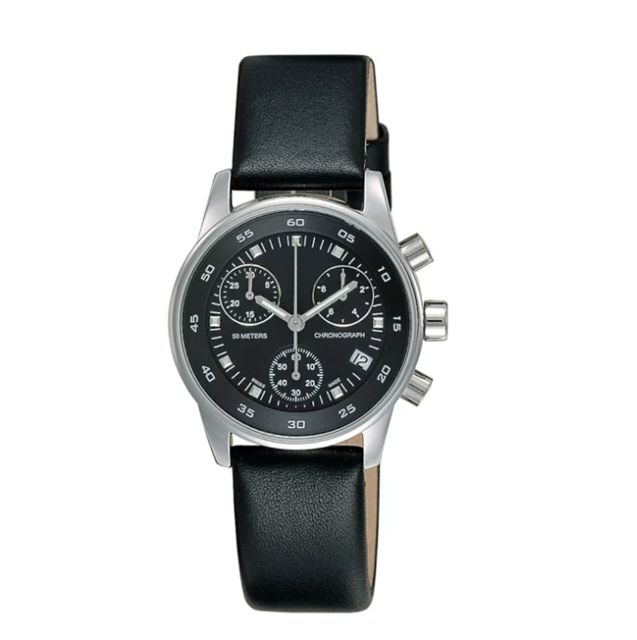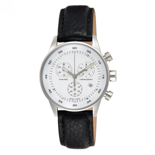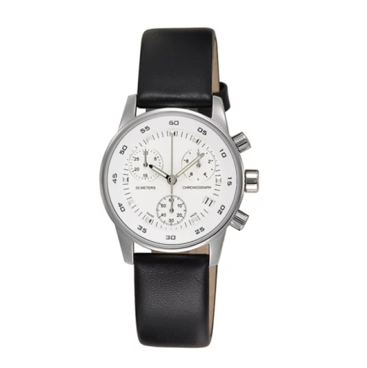 Swiss Made Chronograph Mineralglas EdelstahlgehäuseUnisex: Ø 36 mm / Lady: Ø 30 mm Wasserdicht bis 50 m Quarzwerk Datum Lederband Schwarzes oder weisses Zifferblatt inklusive Verpackung Blackbox No.