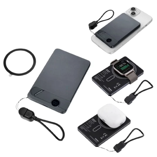 Kabellos, schnell, magnetisch! 3-in-1 Powerbank aus Kunststoff und Aluminium, MagSafe-kompatibel; ermöglicht kabelloses Laden (bis 15 W) unterwegs durch magnetische Fixierung von Smartphones, Kopfhörern oder Smartwatches, mit LED-Ladestandanzeige und ausklappbarem Metallständer für horizontales und vertikales Aufstellen des Smartphones, inklusive Power Delivery (bis 20 W) USB-C auf USB-C Schnellladekabel und zusätzlichem MagSafe Metallring zur individuellen Befestigung an allen gängigen Smartphones
