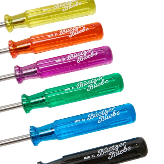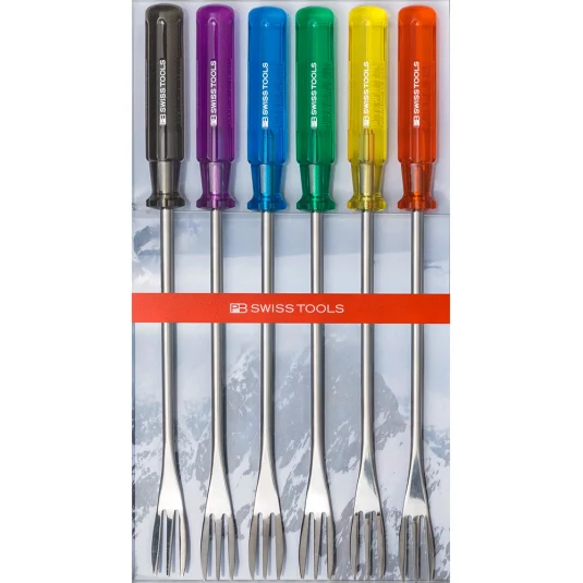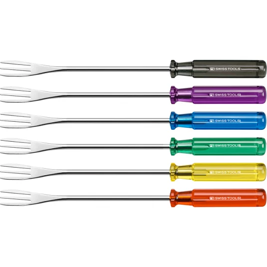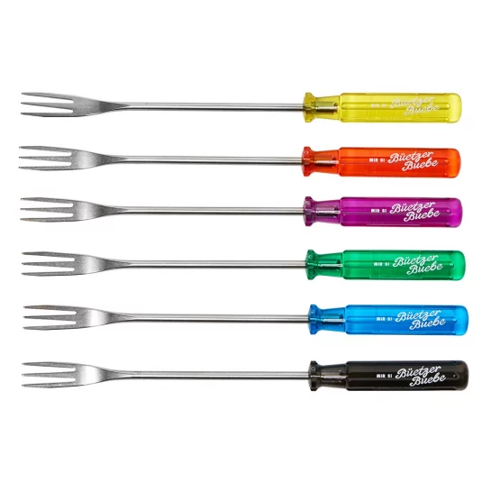 Für ein originelles und gemütliches Käsefondue! Unverwechselbar und im Original Schraubenzieher-Design, 6 glatte Gabeln aus rostfreiem Stahl mit Classic Griffen, auf Wunsch farblich sortiert oder assortiert (rot, gelb, grün, blau, violett, schwarz), lose geliefert