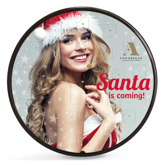 Origineller Adventskalender befüllt mit 23 Stück (113 g) bunt gemischter, feinster Lindor Mini-Kugeln (Weiss, Dunkel, Milch und Caramel) und 1 Lindt-Weihnachtsmann (10 g) Vollmilchschokolade aus dem Hause Lindt & Sprüngli, mit Aufhänger und ausklappbarem Tischaufsteller am Rückenteil, Rahmen nach Wahl in Schwarz oder Chromglanz, individuell bedruckbar auf der Frontseite, Haltbarkeit ca.