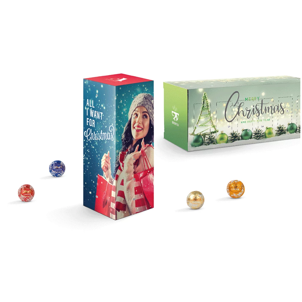 Origineller Adventskalenderturm, befüllt mit 24 Stück (ca. 109 g) feinsten, bunt gemischten Lindor Mini-Kugeln aus dem Hause Lindt & Sprüngli (Sorten bunt gemischt: Milch, Caramel, Weiss), Rundum auf 5 Flächen individuell bedruckbar, Haltbarkeit ca. 6 Monate