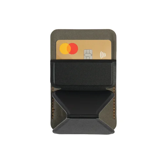 Smartes Etui für unterwegs, bietet Platz für bis zu zwei Kreditkarten und etwas Notengeld, am Mobiltelefon befestigt werden