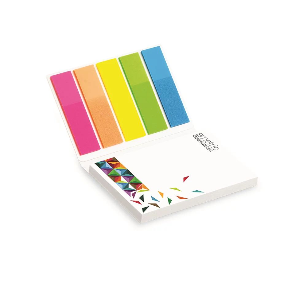Praktisches Set im Softumschlag (250g/m2), mit Haftnotizblock (50 Blatt à 50 x 72 mm, 80g/m2), sowie PET-Folienmarker in 5 verschiedenen Farben (blau, grün, gelb, rosa, orange - je 20 Blatt à 12 x 45 mm, 60 g/m2)), Mindestbestellmenge 100 Stück