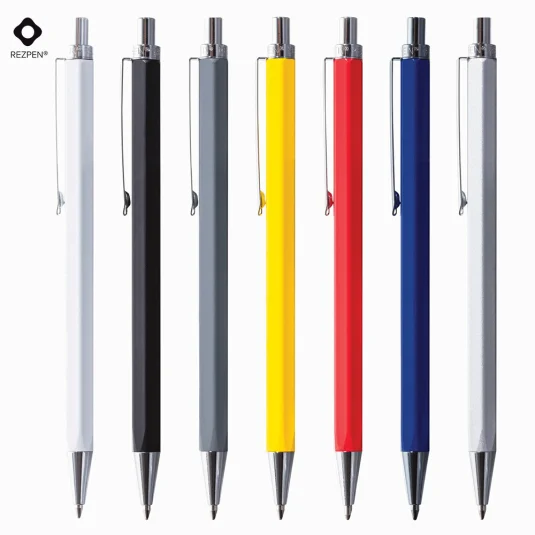 Swiss Design – ein hochwertiges, schlankes Schreibgerät mit Messingschaft und verchromten Beschlägen, ausgestattet mit einer Metall-Grossraum-REZPEN®-Mine (blau), die auf Schweizer Präzisionsmaschinen gefertigt wird und eine Schreiblänge von über 5'000 Metern bietet