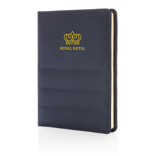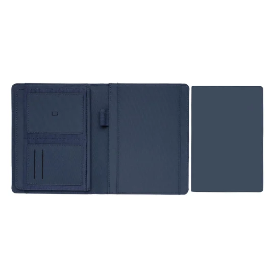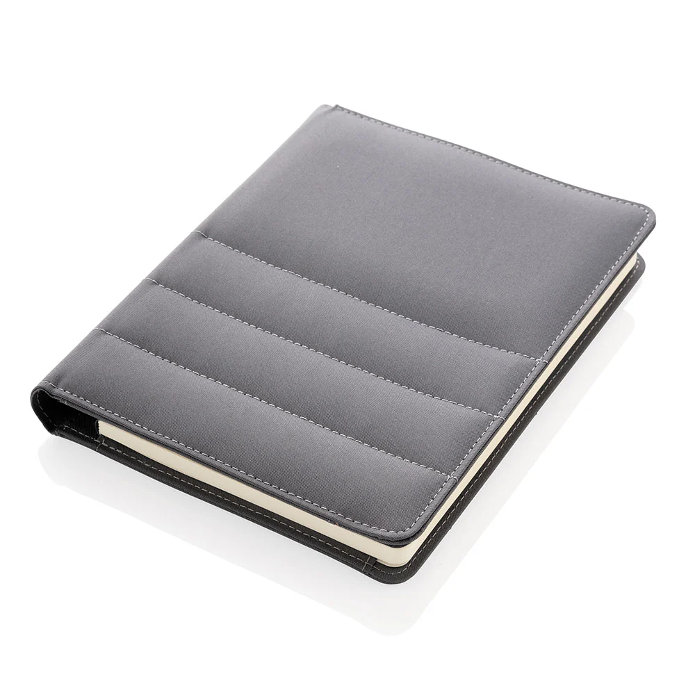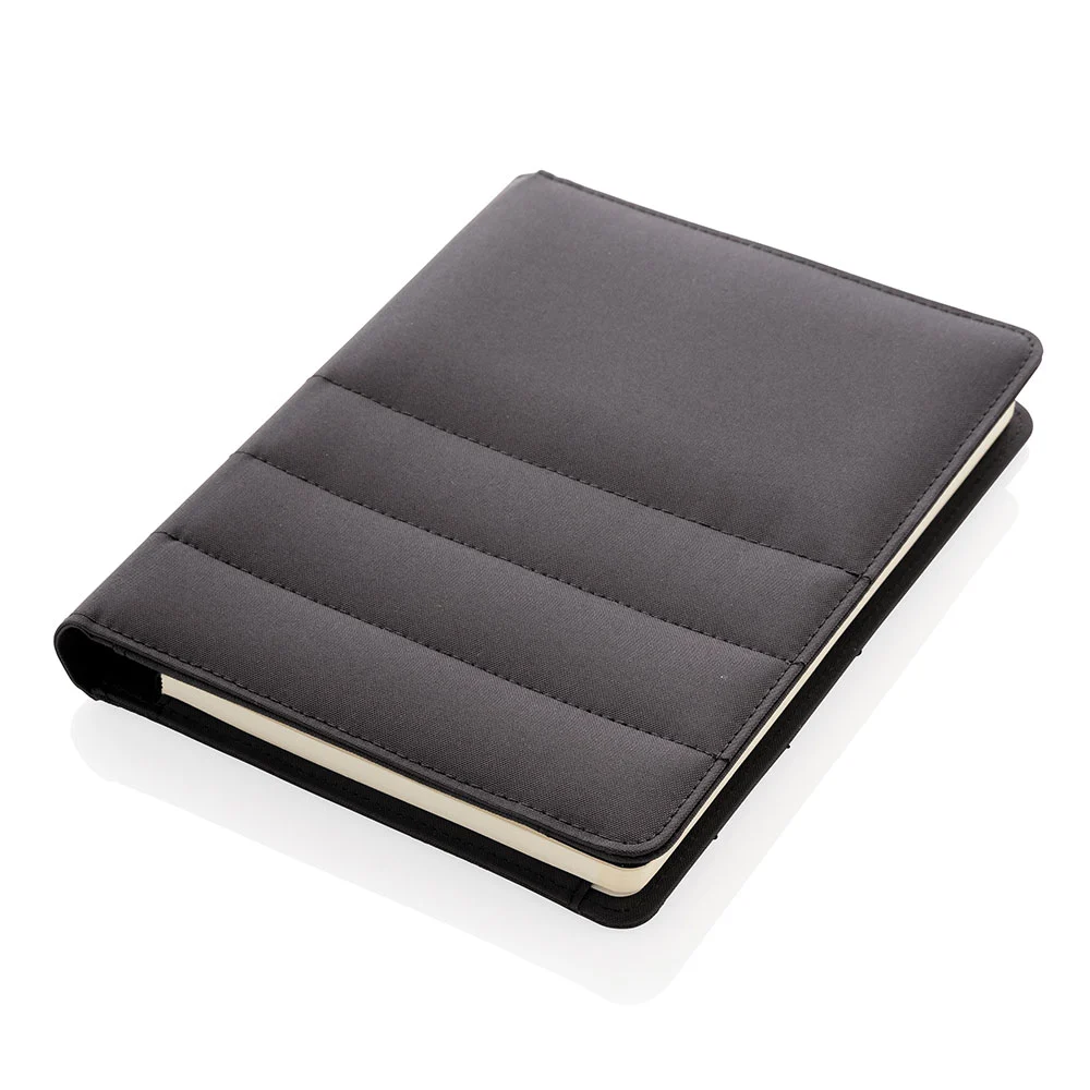 Nachhaltige Schreibmappe aus rezykliertem Polyester, hergestellt aus 7 PET‑Flaschen, mit Organizer, grossem Sleeve‑Fach, Telefontasche, zwei Kartenfächern und einer Stiftschlaufe; inklusive Block mit 128 linierten Seiten (80 g/m²) aus rezykliertem Papier