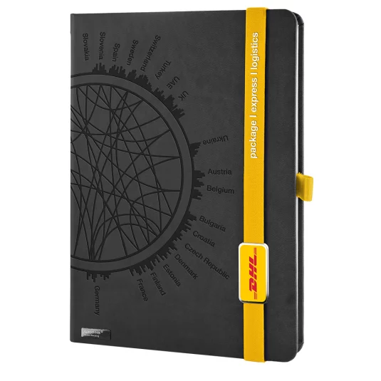 Originelles, individuell gestaltetes Notizbuch, Material Tucson, Elastikband und Stiftschlaufe in individueller Farbe (Pantone) mit Aufdruck, Lanybutton mit Geldoming, Blindprägung auf Deckel