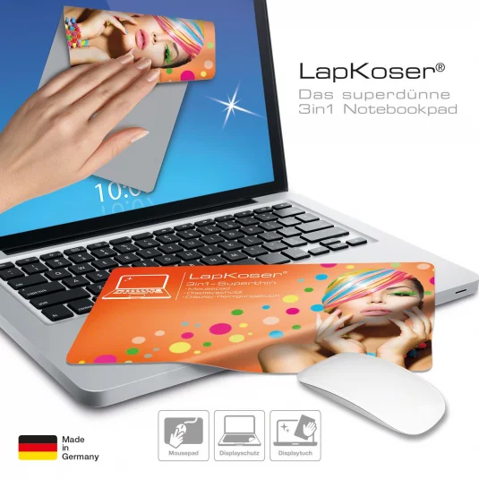 Praktisches, superdünnes Pad mit 3 Funktionen; Displayschutz für Notebooks, Mousepad (Rückseite mit RDX Anti-Slip-Beschichtung) und Display-Reinigungstuch (Vorderseite aus Microfaser P-9000®HD)