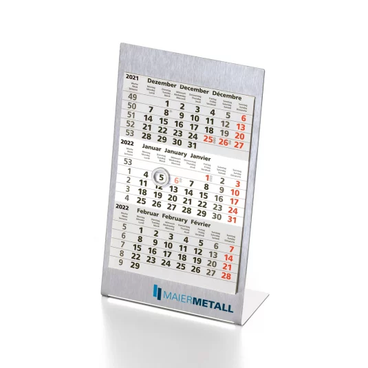 Stylischer Tischkalender aus gebürstetem Edelstahl, mit magnetischem Kalendarium für 1 Jahr (12 Blatt, kopfgeleimt) und Magnetring als Tagesschieber, inklusive internationale Feiertagskennzeichnung, 3-sprachig (D, GB, F)