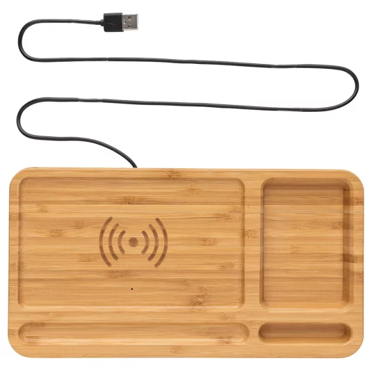 Exklusive Wireless-Ladestation aus Bambus, dient gleichzeitig als dekorativer Schreibtisch-Organizer, zum kabellosen, schnellen Aufladen von mobilen, Qi-fähigen Geräten wie z.