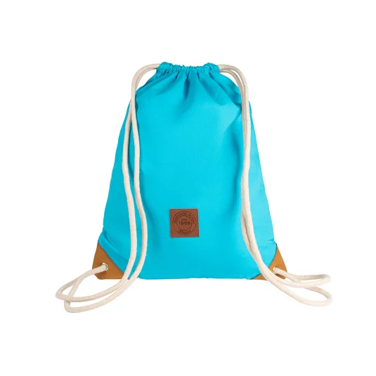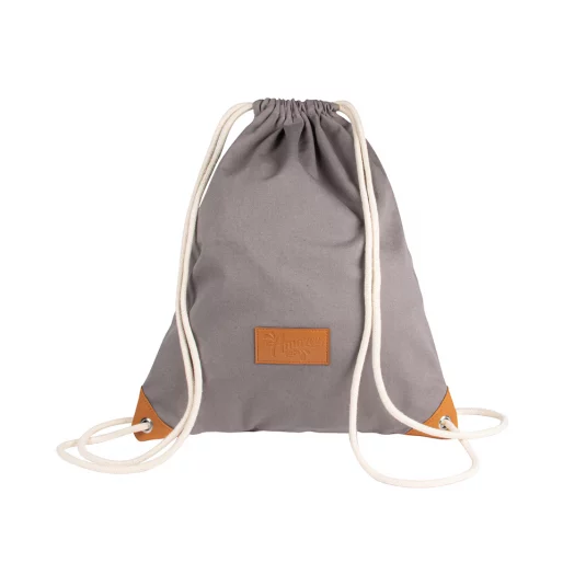 Trendige Tasche aus Baumwolle 225 g/m² (8 ozs), Kordelzüge dienen gleichzeitig als Umhängegurte, untere Enden mit Metallösen und Kunstlederecken verstärkt, Mindestbestellmenge 250 Stück