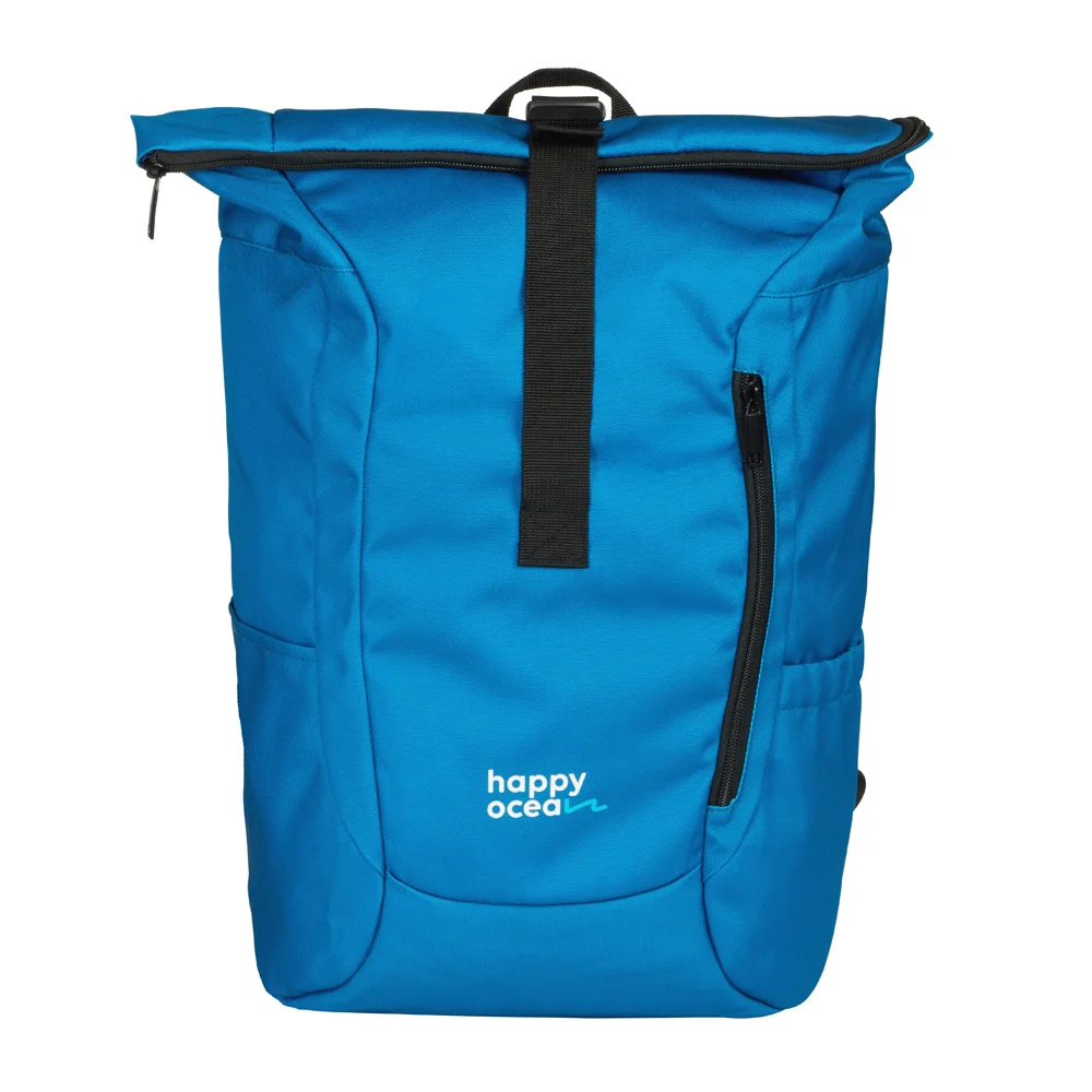 Urbaner Rucksack aus 100% rezykliertem Ozean-Plastik, hochwertig und wasserabweisend, mit Innenseite aus Polyester, grossem Reissverschluss-Hauptfach, trendigem Rollverschluss, Reissverschluss-Aussenfach und längenverstellbaren Schultergurten, Mindestbestellmenge 300 Stück