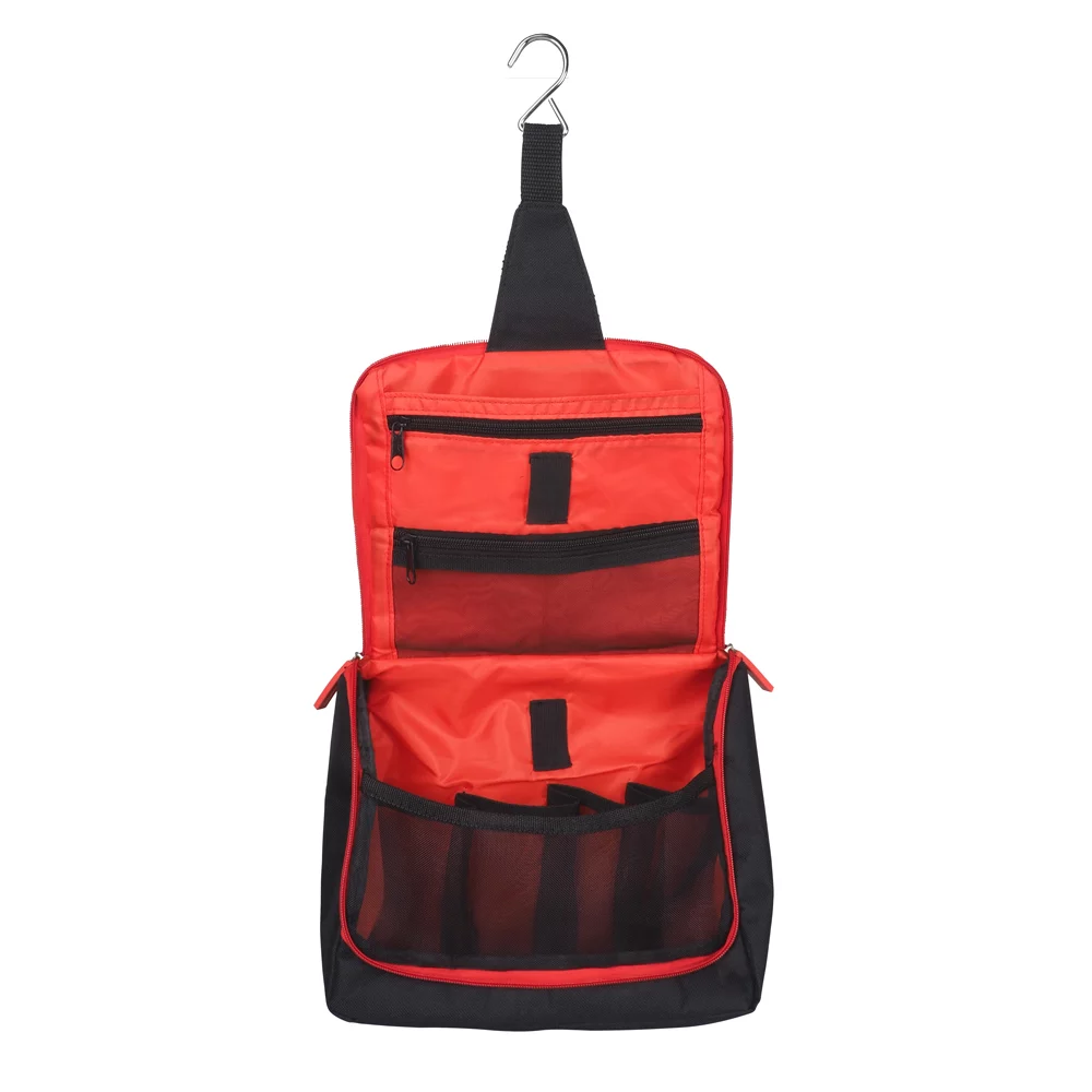 Umweltfreundlicher Kulturbeutel aus rezykliertem PET-Material (600D rPET), aufklappbar, mit Metallhaken zum Aufhängen, innen mit diversen Fächern und Unterteilungen, Mindestbestellmenge 300 Stück