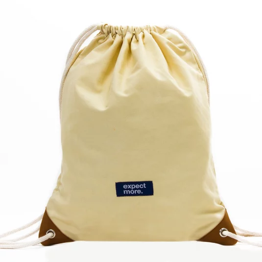 Light bag of cotton, draw cords also serve as shoulder straps, lower ends strengthened with metal eyelets and artificial leather corners, minimum order 250 pcs