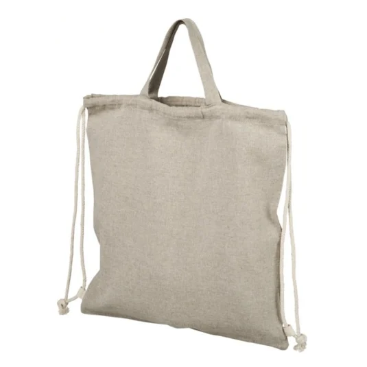 Sustainable classic bag made from consumer waste in textile factories made of recycled cotton 150 g m2 and recycled polyester with two short handles and a convenient cotton drawstring