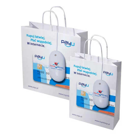 Carrier bag of FSC kraft paper 200 g/m2 (matte or shiny surface available, with twisted textile cord, reinforced edge and inlaid base card, also available in other sizes (price on request), minimum order 500 pcs