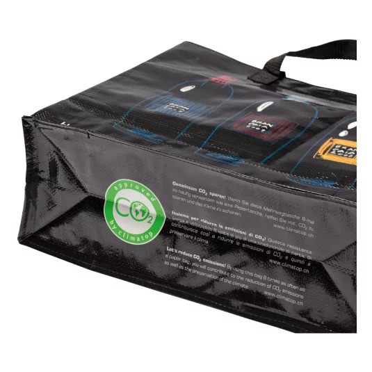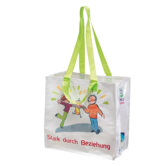 Environmentally-friendly, because it can always be reused! Attractive shopping bag in multicolor personal design, of polypropylene, with sturdy carrying straps, minimum order 1000 pc, other sizes possible (price on request)