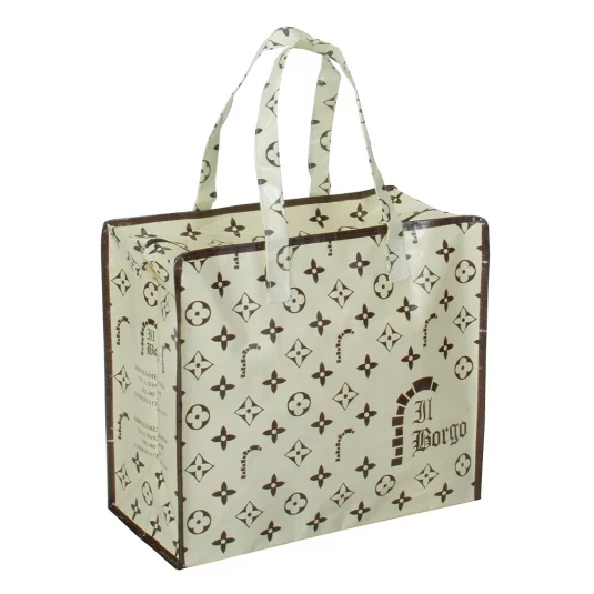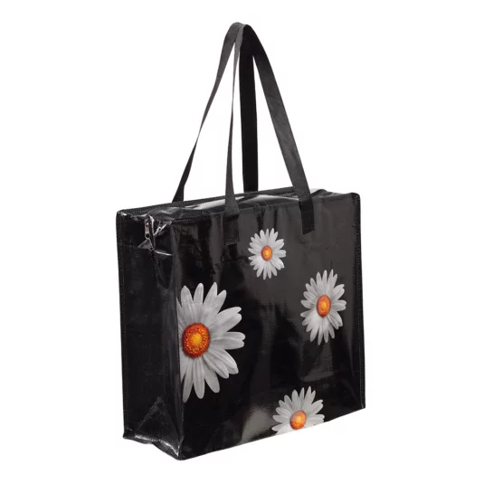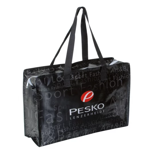Trendy bag for shopping, beach or fairs! Leisure and shopping bags in colorful personal design, of polypropylene, with zipper and sturdy carrying straps, minimum order 1000 pc