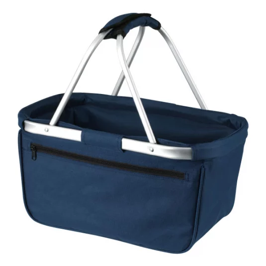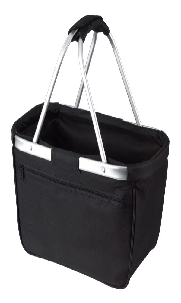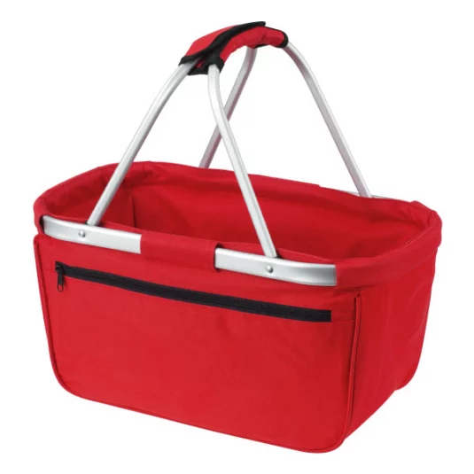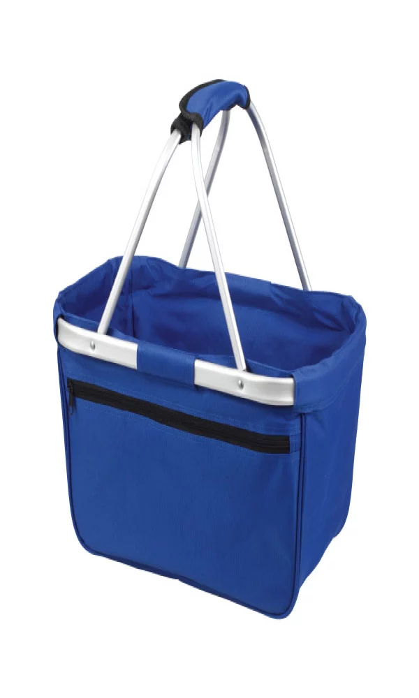 Attractive shopping basket of polyester with aluminum border and zipper front pocket, folding