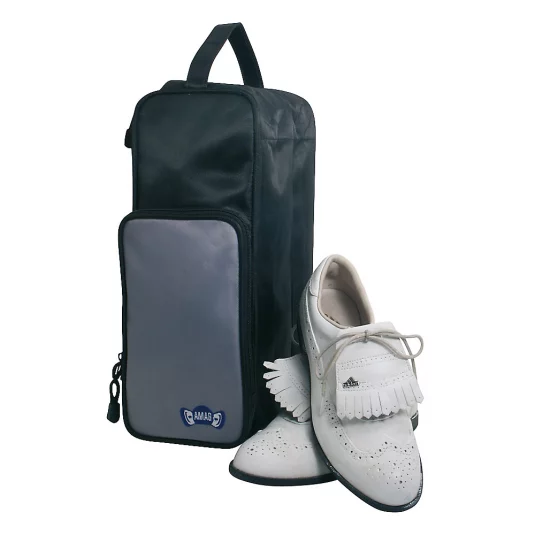 Elegant shoe bag of solid nylon, with 2 separate compartments for the golf shoes and mesh inset (for optimum ventilation), 1 outer pocket, viewing window for address label, minimum order 100 pcs, other color combinations on request