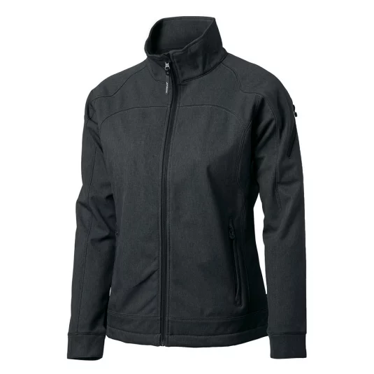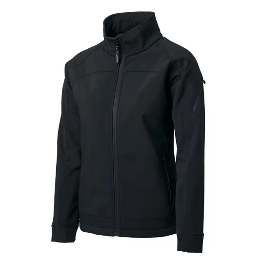 Softshell jacket with excellent cut of soft 3-layer functional softshell, breathable, wind and water proof, trendy double stitching, diagonally set zipper on upper arm, rubberized zipper flap, 2 zipper side pockets, tailored