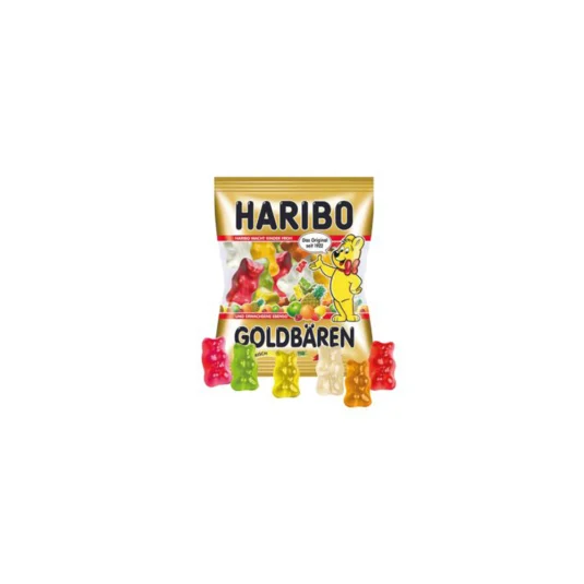 Mini Goldbears by Haribo in the original pouch, mixed flavors including pineapple, apple, strawberry, raspberry, orange and lemon, including a customizable foldable card, shelf life approx.
