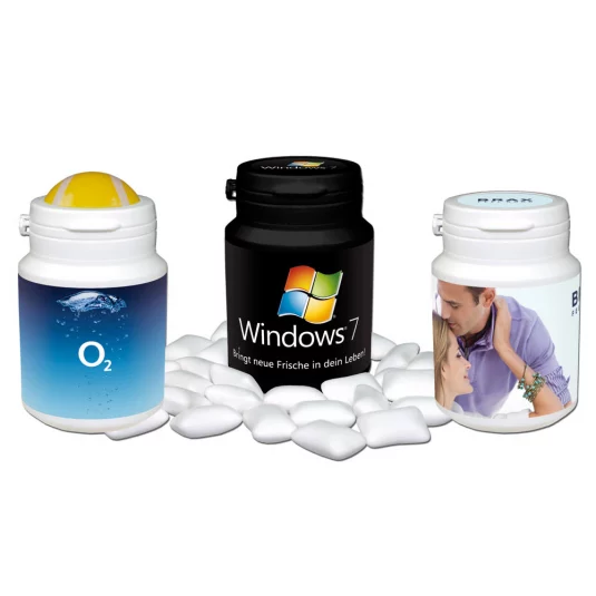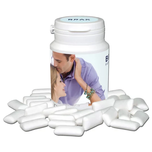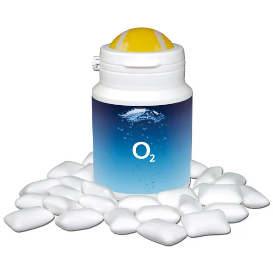 Handy plastic box filled with approx. 30 sugar-free chewing gums; the liquid middle gives a unique sensation of freshness, minimum order 500 pcs, also available with 3D lid decoration (soccer ball, tennis ball, basket ball or golf ball)