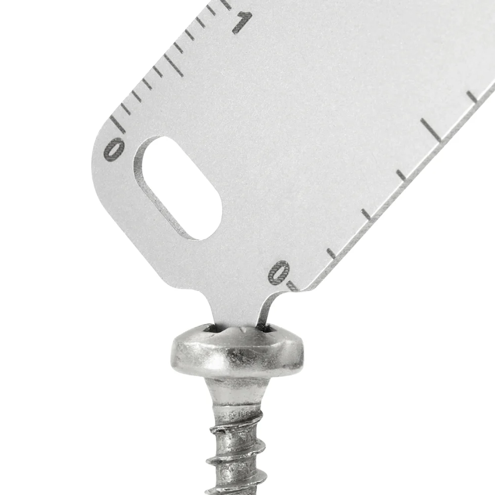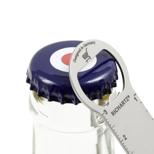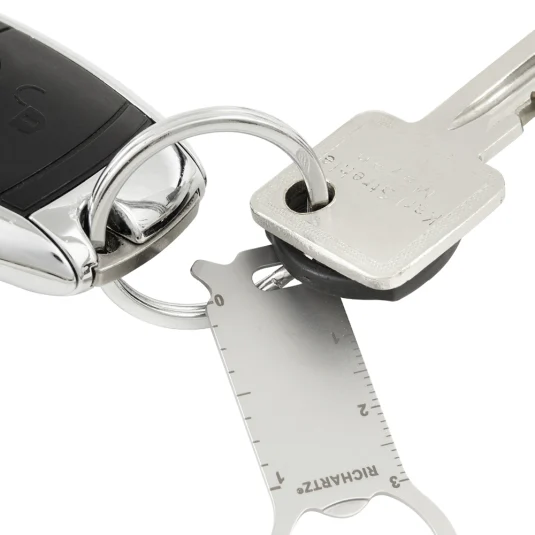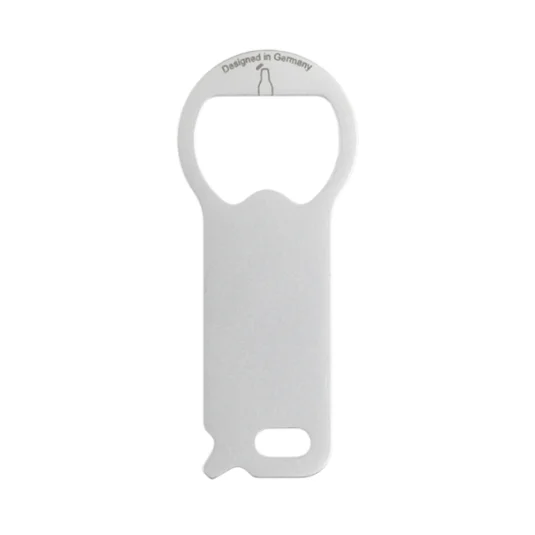 Shopping trolley remover for the key ring made of stainless steel, with additional practical functions; bottle opener, centimetre ruler and screwdriver