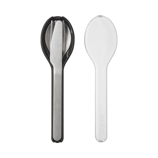 3-piece stainless steel cutlery set; with knife, fork and spoon, compactly held together and protected in an original, reusable plastic case, dishwasher safe