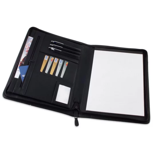 Well-liked conference folder with outer and inner zippers, organizer and half-moon shaped metal plate (front), delivered with checked pad