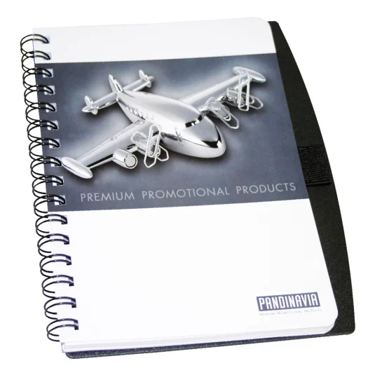 Handy pad with plastic cover and Wiro binding, colorful printed front page in own design can be printed, contents 75 sheets paper, 80 g/m2, checked, on the side elastic loop for a pen, minimum order 100 pc