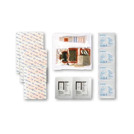 Practical, small emergency box made of frosted plastic, filled with 12 waterproof plasters, 4 skin-cleaning swabs, 2 dry swabs and 1 repair kit