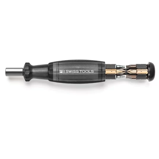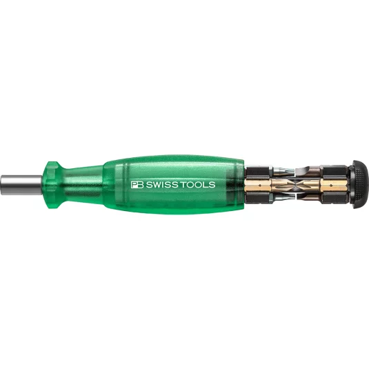 Swiss made, first class screwdriver of frosted plastic and stainless steel, 8-part bit-magazine integrated in handle, from 1000 pc handle can be any Pantone color