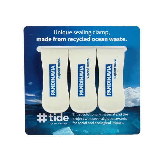 For the protection of the oceans - we give waste a value! Set consisting of 3 sustainable sealing clips made of #tide ocean material® (100% recycled PET and plastic) developed in Switzerland, the practical clamp closes hard and soft food bags securely and easily, including individual cardboard packaging