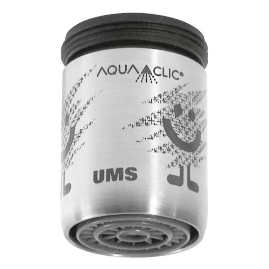 Save electricity and water comfortably and elegantly (Swiss made!). Clever stainless steel water-saving unit for kitchen and bathroom taps, reduces water and electricity consumption by up to 50%, personalized design from 100 pcs, logo and design are durably applied with anthracite-colored ceramic