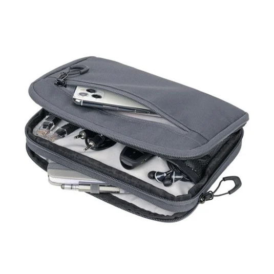 Practical, hard-wearing bag for electronic accessories, made from recycled marine plastic, 1 compartment with 2-way zip and 6 mesh pockets