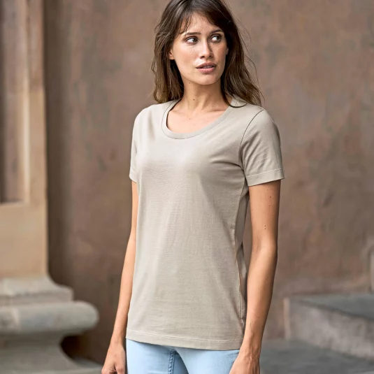 Classic women's T-shirt with round neck, shoulder-to-shoulder neck band, 2-layer neck binding with elastane, mercerized, pre-shrunk