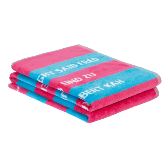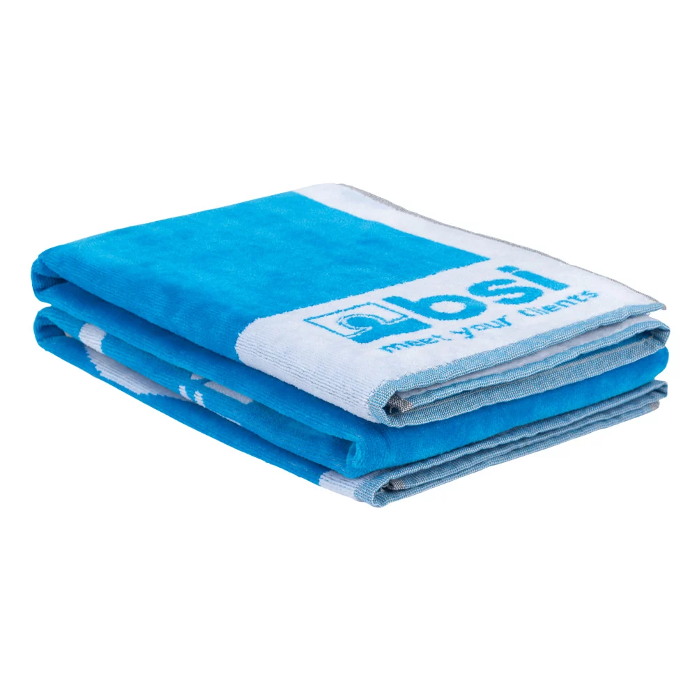 Agreeably soft 100 % cotton beach towel, jacquard-weave, with 2-tone full-color weave, color and design as desired, minimum order 150 pcs Qualities: 400 g/m2, 450 g/m2, 500 g/m2 Measurements: Masse: 50 x 100 cm/MOQ 1000 pcs.