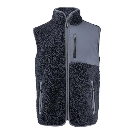 Two-coloured sherpa fleece waistcoat. Contrasting material on the chest and piping along the edges of the seams. Chest pocket and side pockets with zip. This item is supplied in a compostable polybag.
