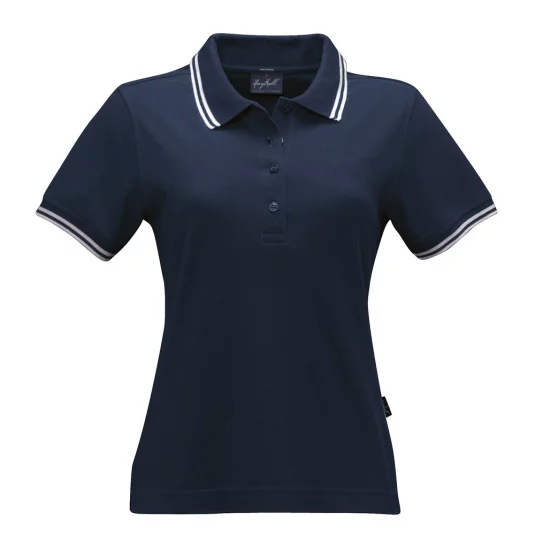 Women's polo shirt of fine mesh cotton piqué with narrow contrast stripes, body-skimming cut.