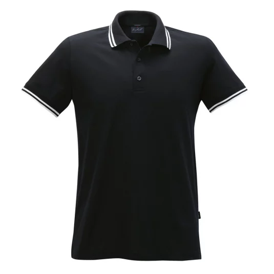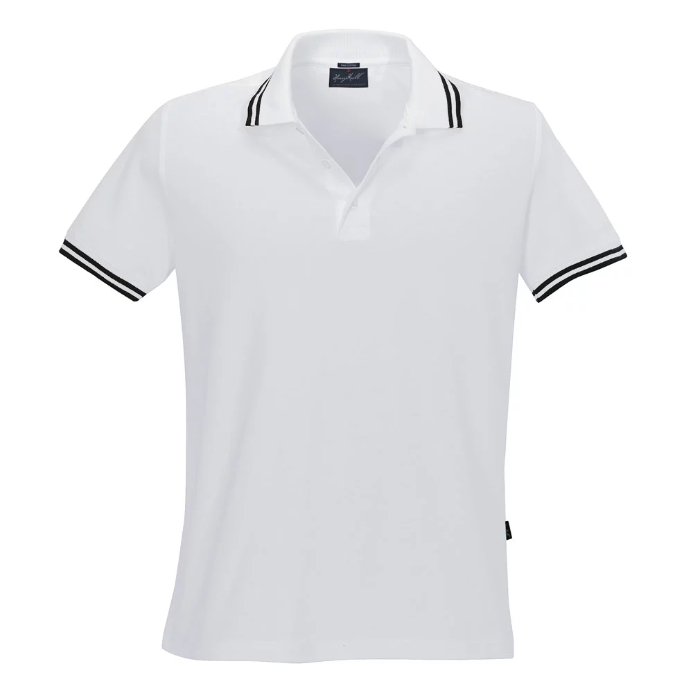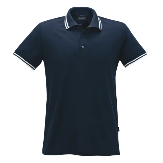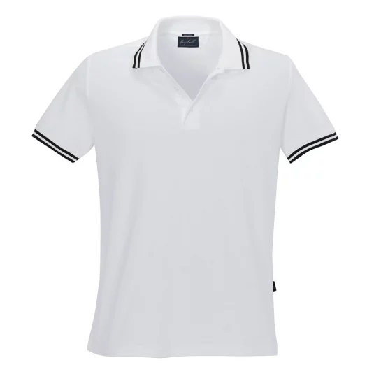Men's polo shirt of fine mesh cotton piqué with narrow contrast stripes, body-skimming cut.