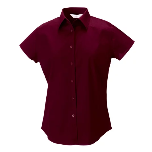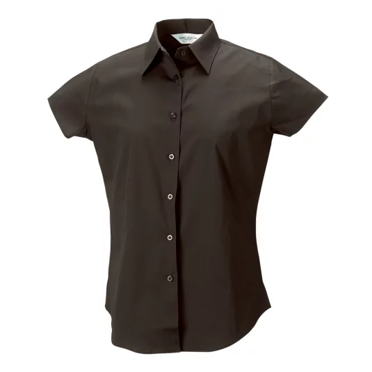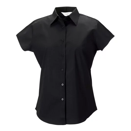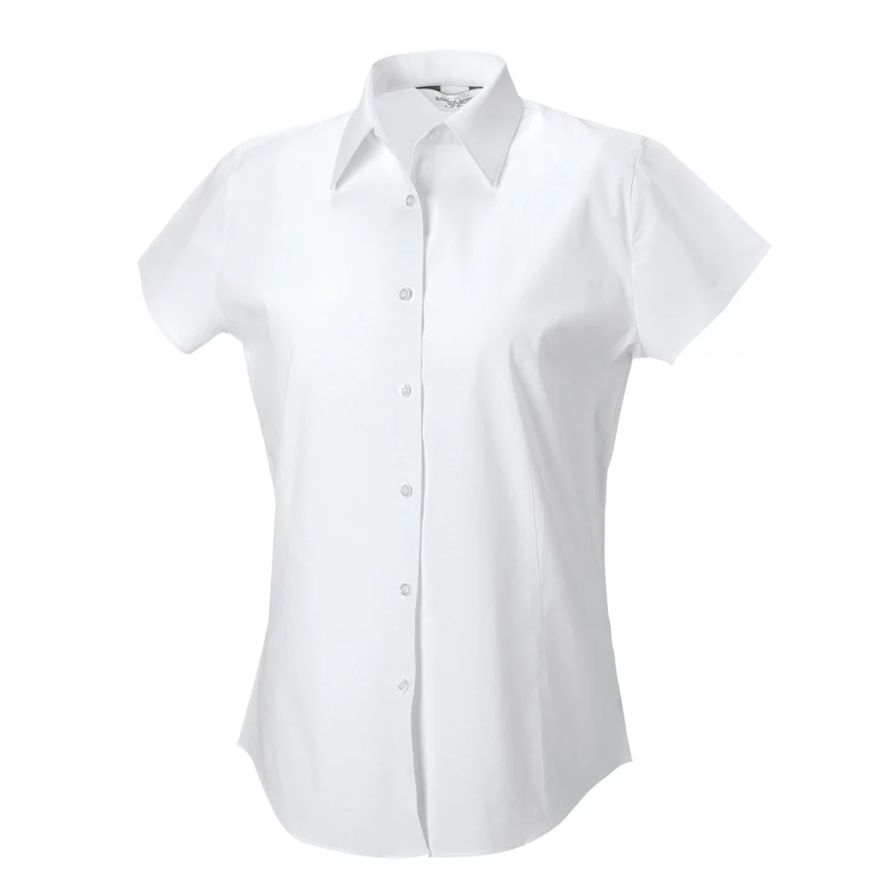Russel stretch women's short-sleeved blouse, classic collar, front and back darts for perfect fit, shortened short sleeves, rounded hem