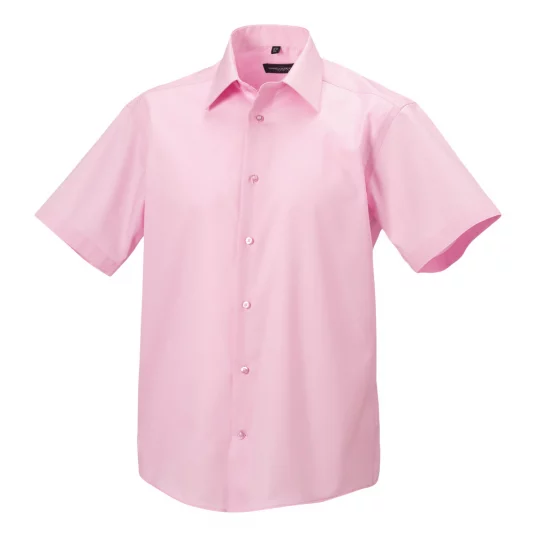 Russel body-skimming short-sleeved men's shirt of no-iron fabric, half spread collar stiffened with stays, rounded hem
