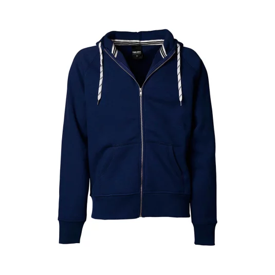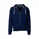 Trendy sweat jacket with hood, drawstring in contrasting color, patch pockets, elastic ribbing on sleeves and hem, full zipper in front, double stitching
