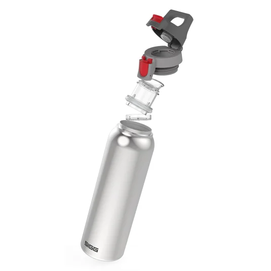 Swiss quality and design! Extra-light, double-walled thermo bottle made of high-quality, 90% recycled stainless steel with excellent insulation which keeps drinks hot for up to 13 hours - or cold for up to 30 hours, including removable tea strainer with integrated flavour-neutral drinking lip, with tried-and-tested ONE closure (one-handed operation) and an anti-slip pad on the base of the bottle, capacity 0.55 l