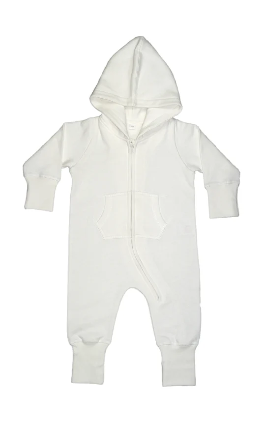 Baby all-in-one with very soft and fluffy inside, single hood, saddle in the neck, neck tape, zip from neck to lower leg for easy dressing and finishing, kangaroo pocket, wide ribbed cuffs and leg ends, easy to relabel.
