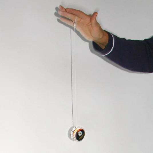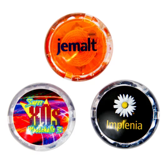 Yo-yo with auto-return function and light (yellow, white or red), transparent rim, inner color as desired, minimum order 500 pc