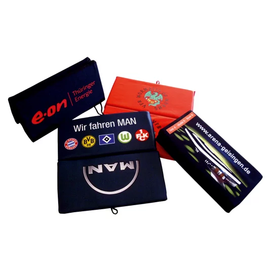 Absolutely comfortable and sturdy seat cushion with carrying straps, upper side of breathable polyester weave, underside of waterproof and sturdy PVC in black leather look, other types of cushion possible (price on request)