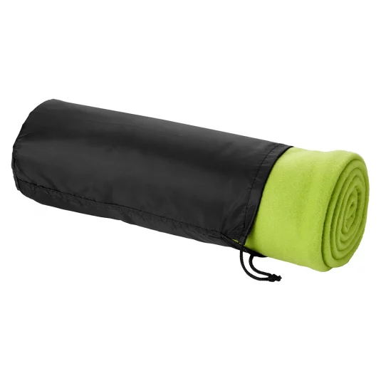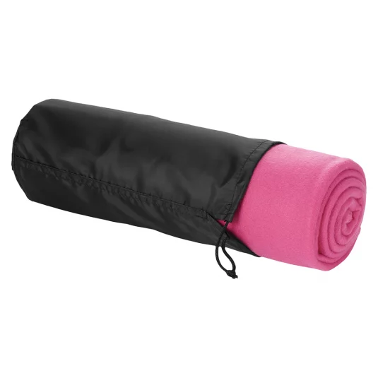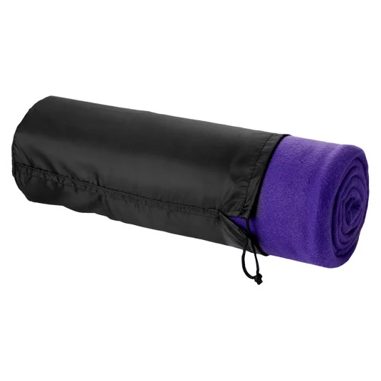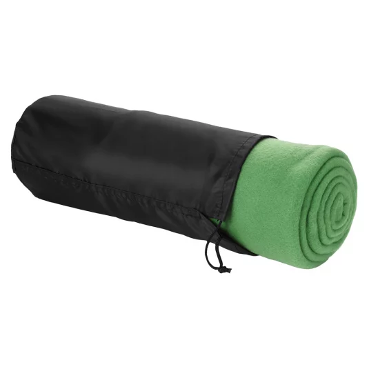 Attractive camping, picnic or beach blanket of edged polyester fleece, packed in a black nylon bag